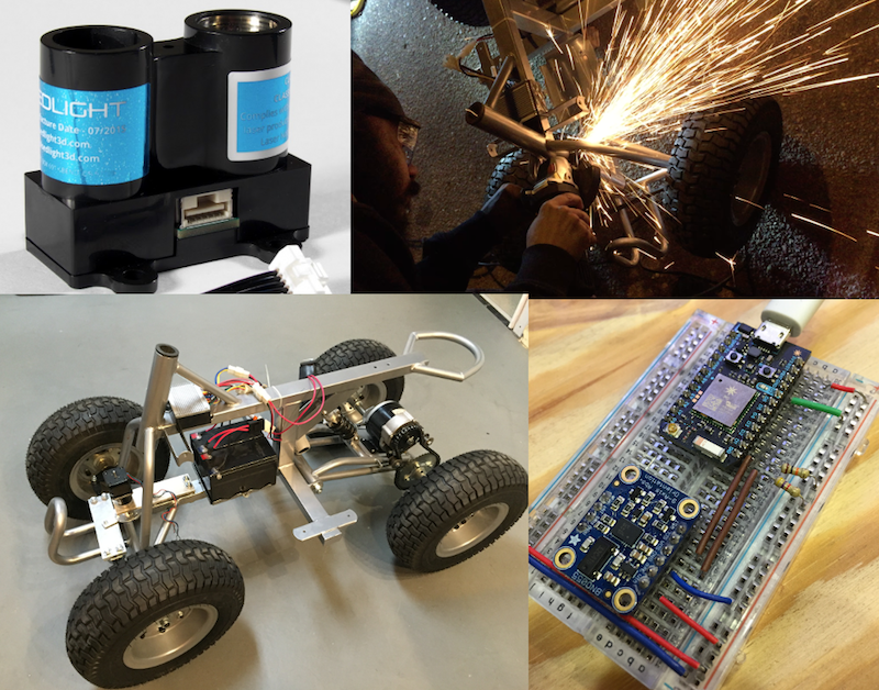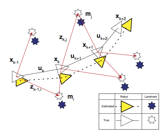 Simulation: autonomous navigation using predefined waypoints, landmarks observed with a rangefinder, and Bayesian filtering